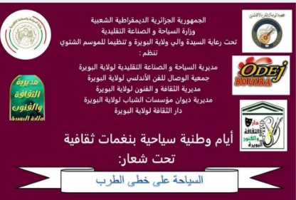 يحتضن المسرح الجهوي عمار العسكري بولاية البويرة، خلال أيام 25 و26 و27 ديسمبر 2025، فعاليات الأيام الوطنية السياحية تحت شعار "السياحة على خطى الطرب"، وذلك في إطار تنشيط الموسم الشتوي، عبر تظاهرة ثقافية تمزج بين الترويج السياحي وإحياء الموروث الطربي الأصيل، وفي مقدمته الطرب الأندلسي.