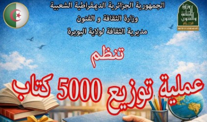 أطلقت مديرية الثقافة والفنون لولاية البويرة، في إطار البرنامج المسطّر لسنة 2025، وبالتنسيق مع المكتبة الرئيسية للمطالعة العمومية، المرحلة الثانية من حملة توزيع 5000 كتاب على مختلف الفاعلين في الحقل الثقافي ومن هيئات وجمعيات ثقافية، تحت شعار "بالكتاب نبني الوعي ونصنع المستقبل".