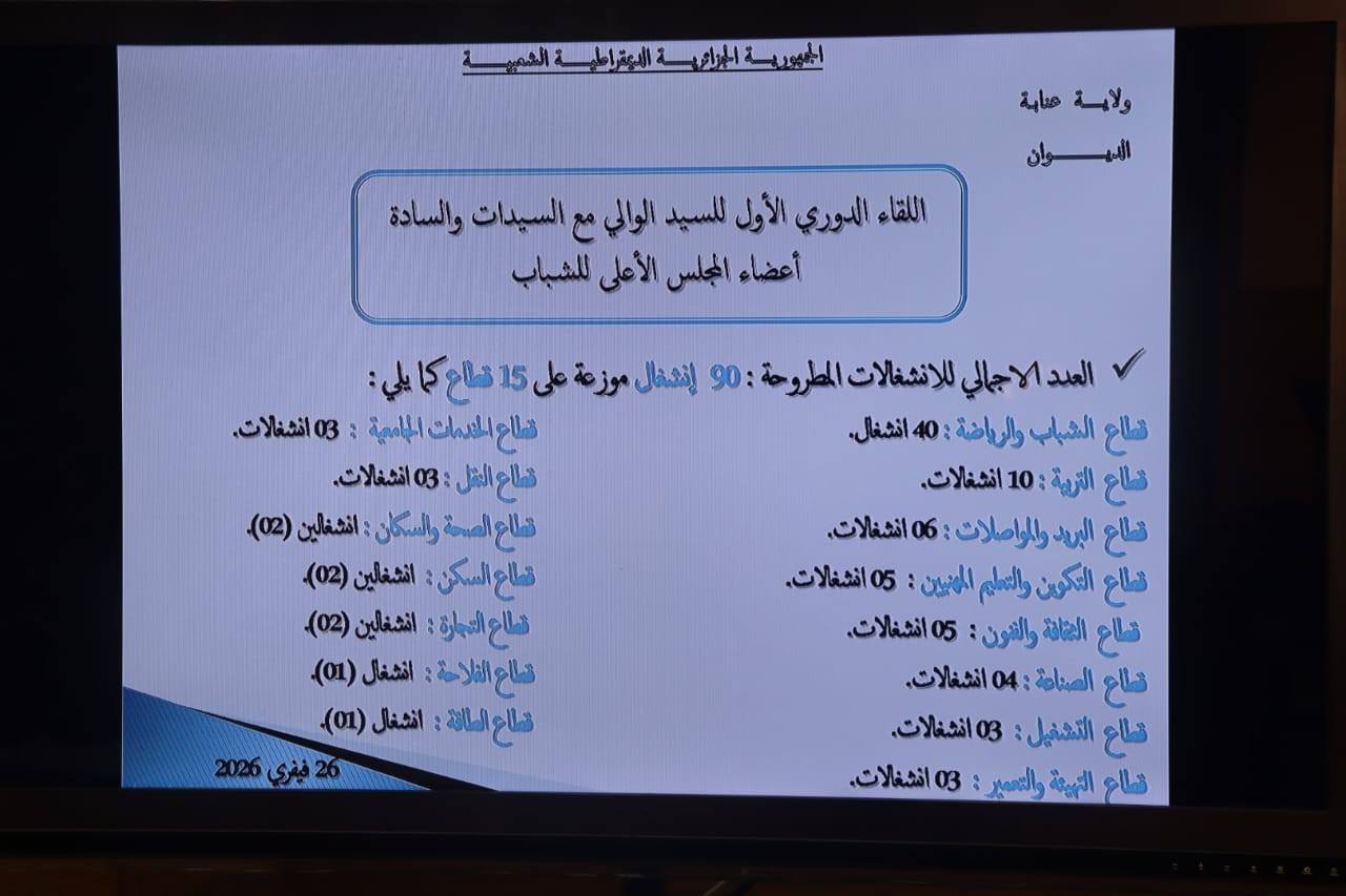 ويهدف هذا اللقاء إلى إشراك الشباب في مسارات التنمية المحلية، ومنحهم فرصة لتقديم مقترحاتهم والمساهمة بشكل فعال في إدارة المشاريع والبرامج المحلية، بما يعزز الشراكة المجتمعية ويؤكد دور الشباب كمحرك أساسي للتنمية في ولاية عنابة، حسب بيان الولاية.